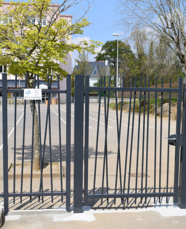 Pose d'une clôture en barreaudage Jungle, solide et élégante, pour encadrer la cour d'une école maternelle.